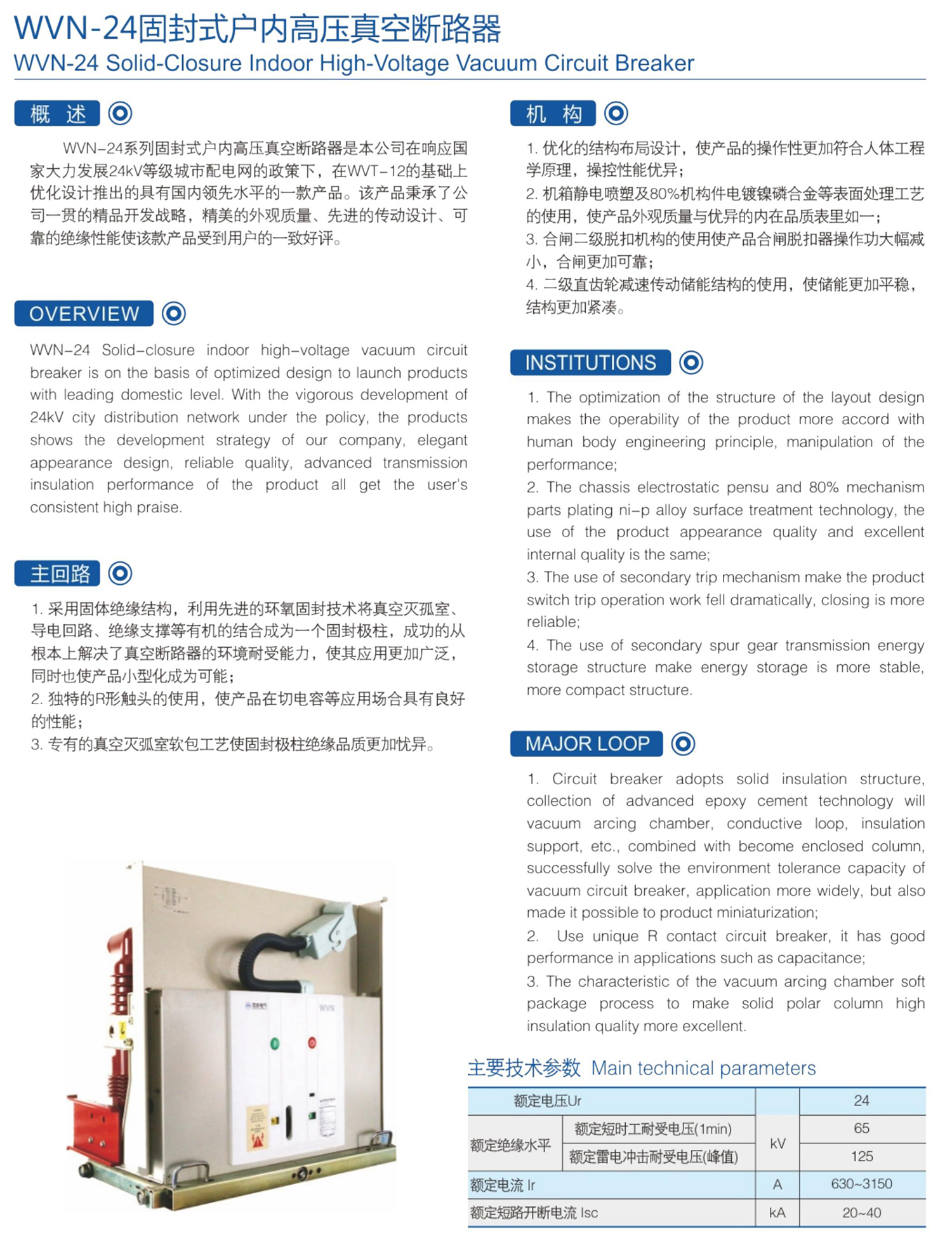 WVN-24 Solid-closure indoor high-voltage vacuum circuit breaker is on the basis of optimized design to launch products with leading domestic level. With the vigorous development of 24kV city distribution network under the policy, the products shows the development strategy of our company, elegant appearance design, reliable quality, advanced transmission insulation performance of the product all get the user's consistent high praise.