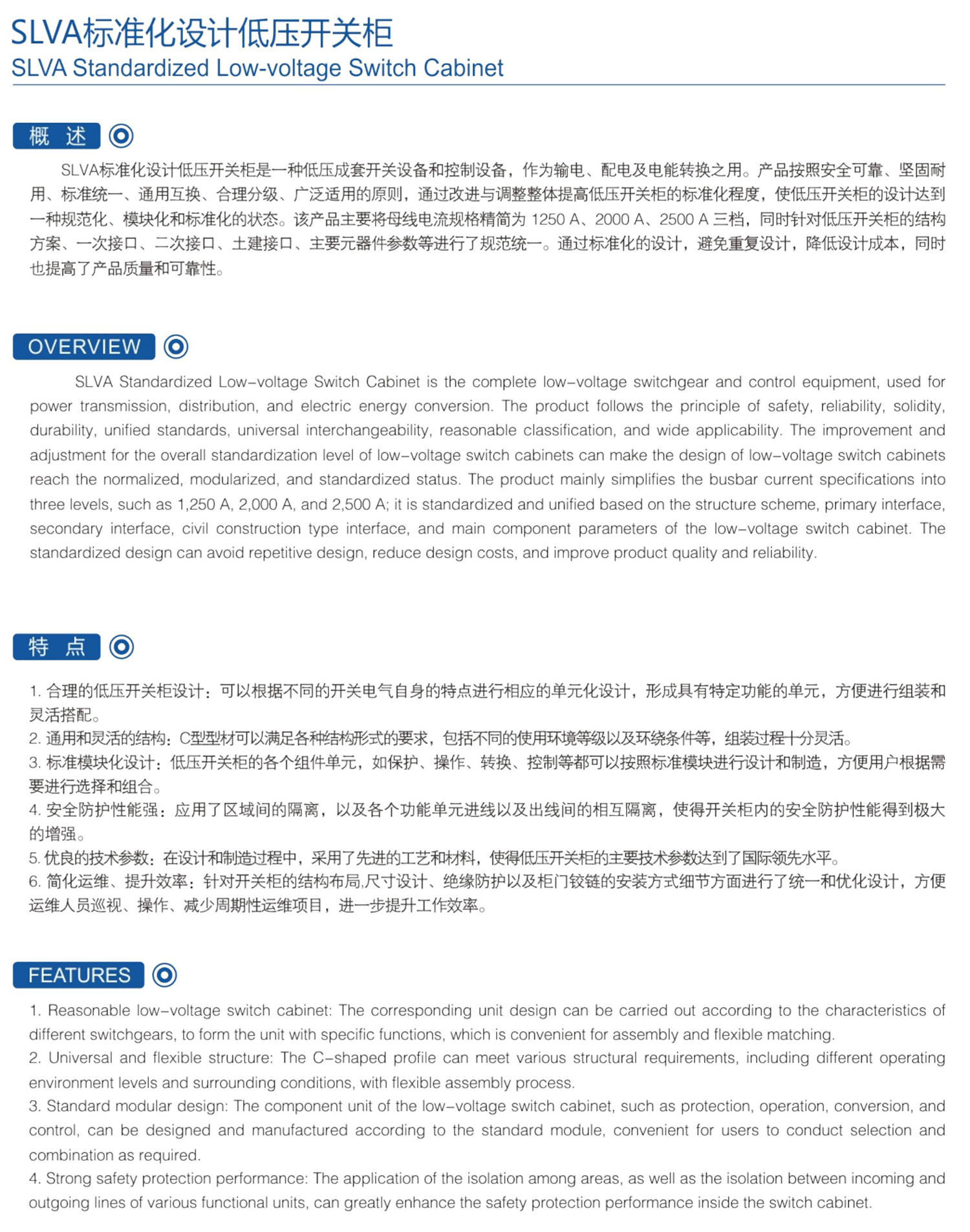 SLVA, Standardized Low-volage Switch Cabinet is the complele low-volage switchgear and conirol equipment, used lopower transmission, distribution, and eleciric energy corversion. The product follws the principle of safety, relabiitly, soliditycurabilly, uniied slandards, universal interchangeabily, reasonable classificalion, and wide apoicabily. The improvement andadjustment for the owarall standardization lavel of low-yotage switch cabinets can make tha design of low-yoltage switch cabinetsreach the normalzed, moduarized, and standardized sialus, The proguct mainly simolies the busbar cwreni specit calons inlotree levels, such as 1,250 A,2 000 A, and 2,500 A: it is slandardized and unilied based on the struclure scheme, primary interface,secondary interface, clvl constructon type nterface, and main component parameters of the low-voliage swtch cabinet. theslandarcized desinn can avoid repelilive dosign, reduce dosikn cosis, and improve product qualily and reliability.